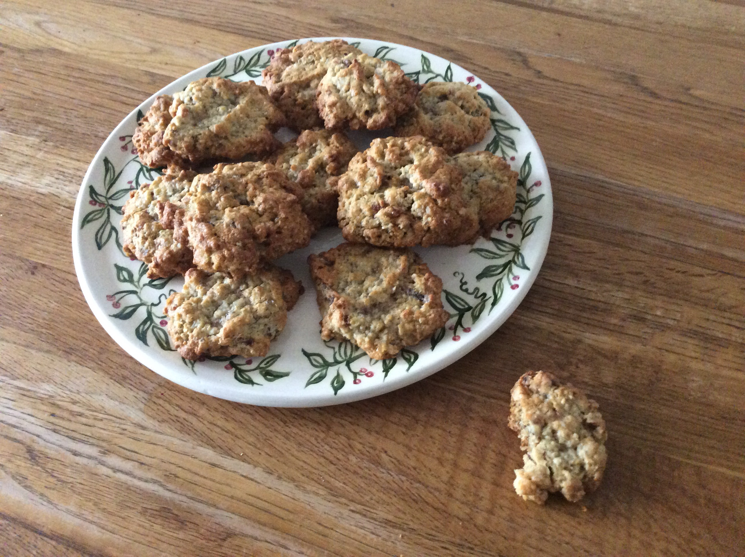 In a food processor (or by hand), put 120g plain flour, 80g sugar, 1 tablespoon cornflour, 1teaspoon bicarbonate of soda, and 60g porridge oats. Briefly mix. Add 90g of soft butter and mix to form fine breadcrumbs. Next add 120g dates, 50g walnuts and 60g grated glacé ginger. Mix again till the dates and walnuts are chopped into the flour mixture. If you are doing this by hand then chop the dates and walnuts and add to the flour mixture. Finally add 1 egg and mix lightly to form a sticky dough. Put heaped tablespoons of this mixture onto greased baking sheets and cook at 180’c for 8-10 minutes till golden round the edges but not too golden or they loose their chewy texture. Enjoy xxx