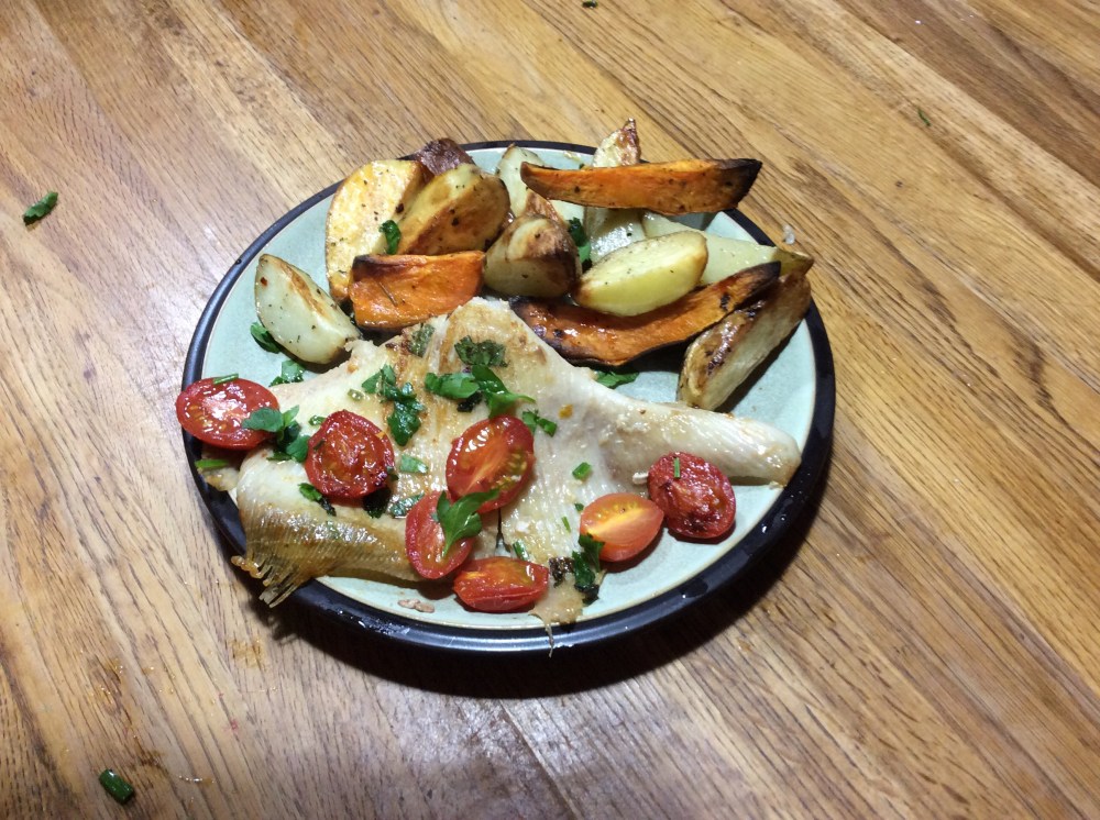 Main- skate wing with lemon, parsley and cherry tomatoes with potato wedges