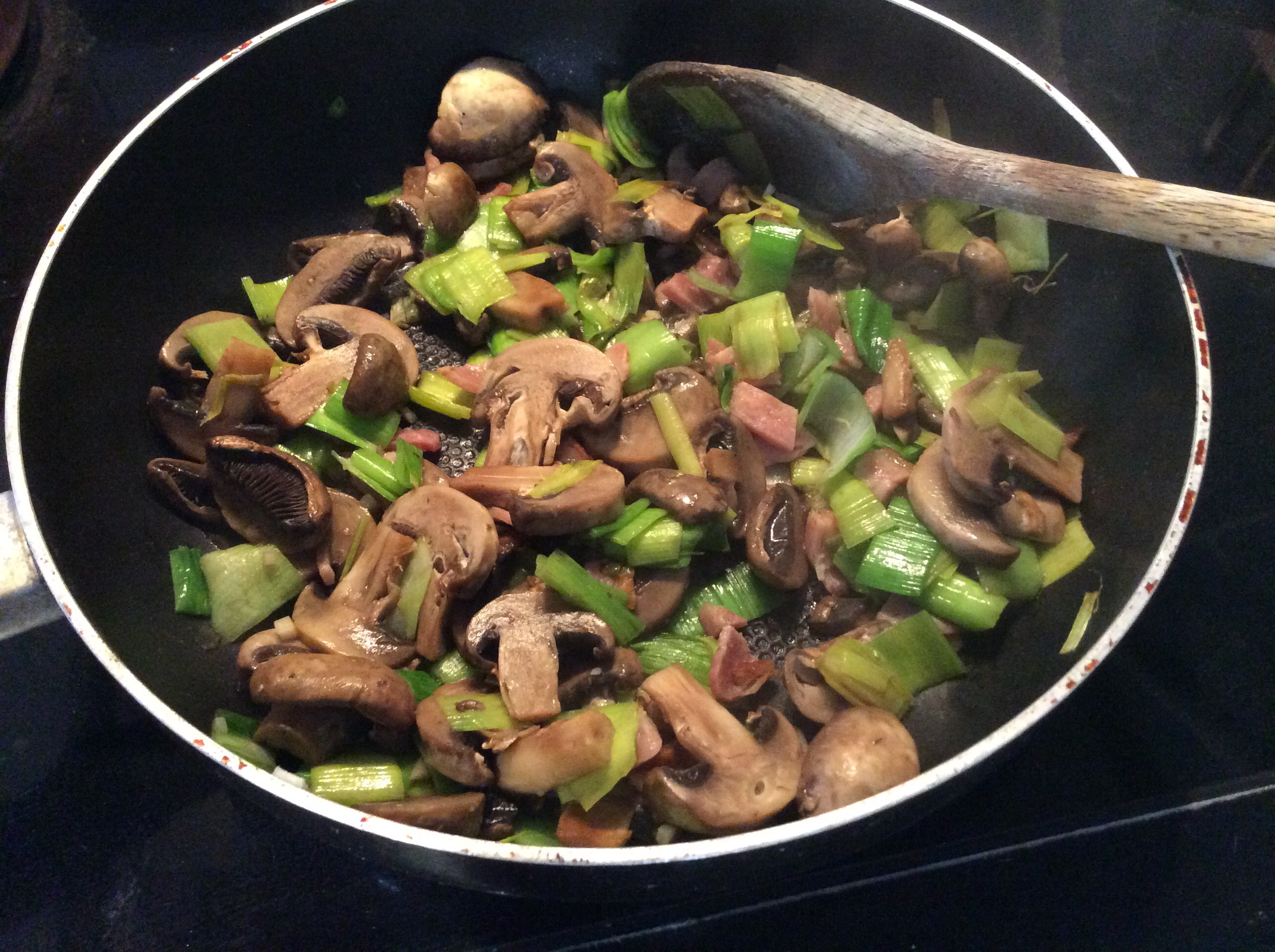 Spaghetti with leeks, mushrooms and bacon in a creamy sauce.