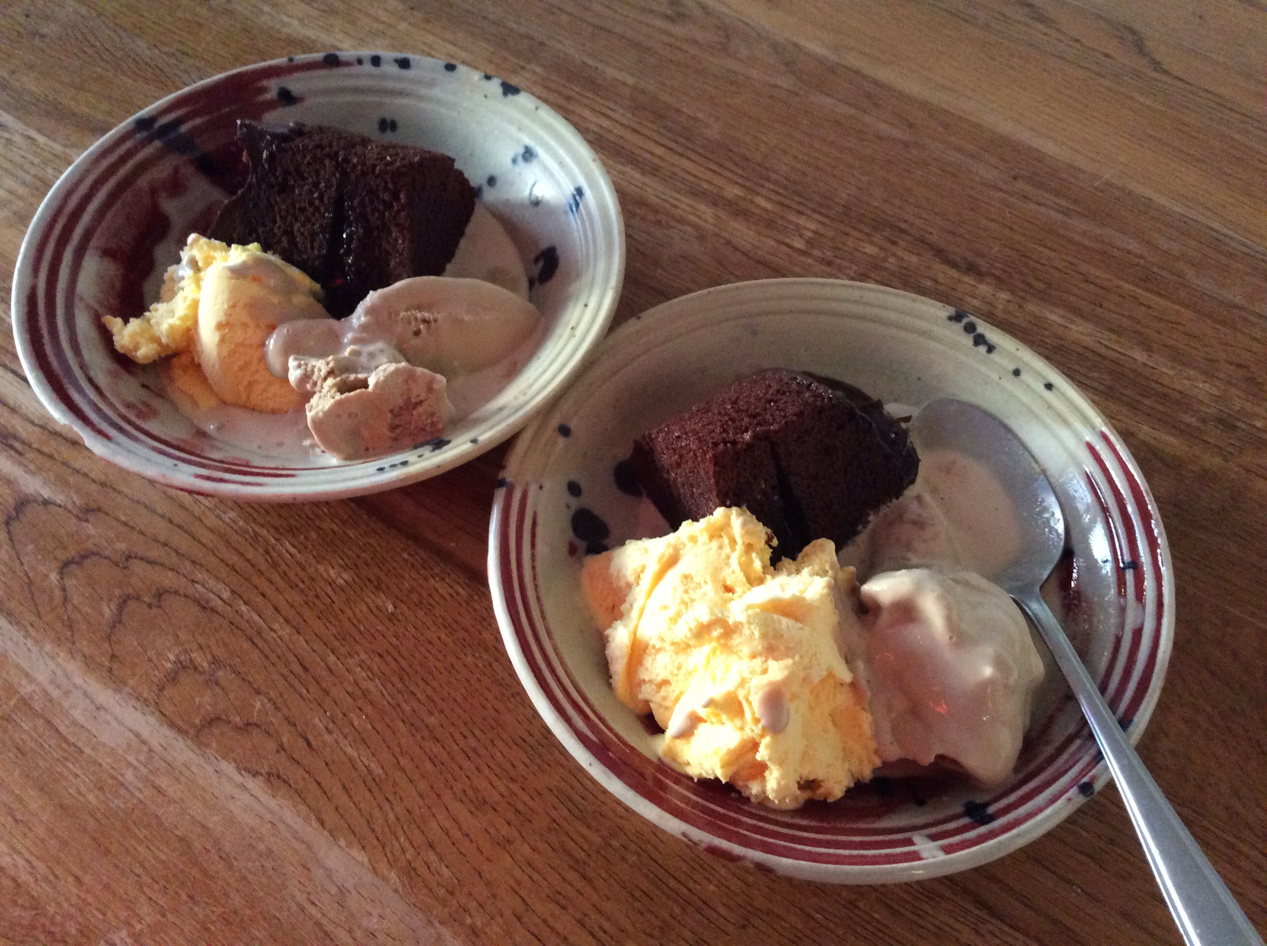 Chocolate cake warmed in the microwave served with coffee and vanilla ice cream š