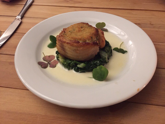 Skate wing fish cake on a bed of chard with a sorrel cream sauce