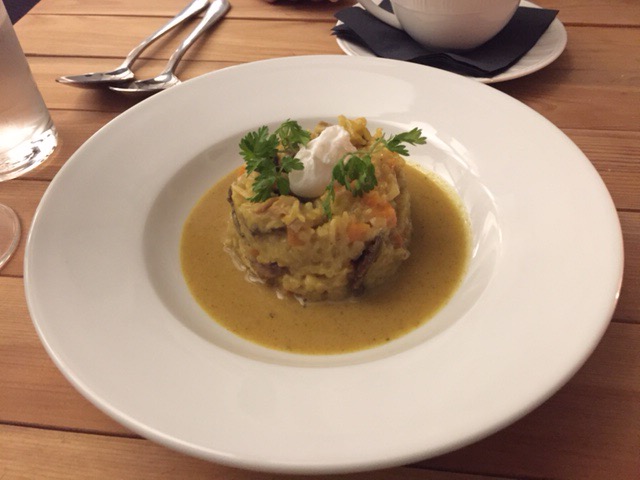 Saffron milkcap kedgeree topped with a quails egg