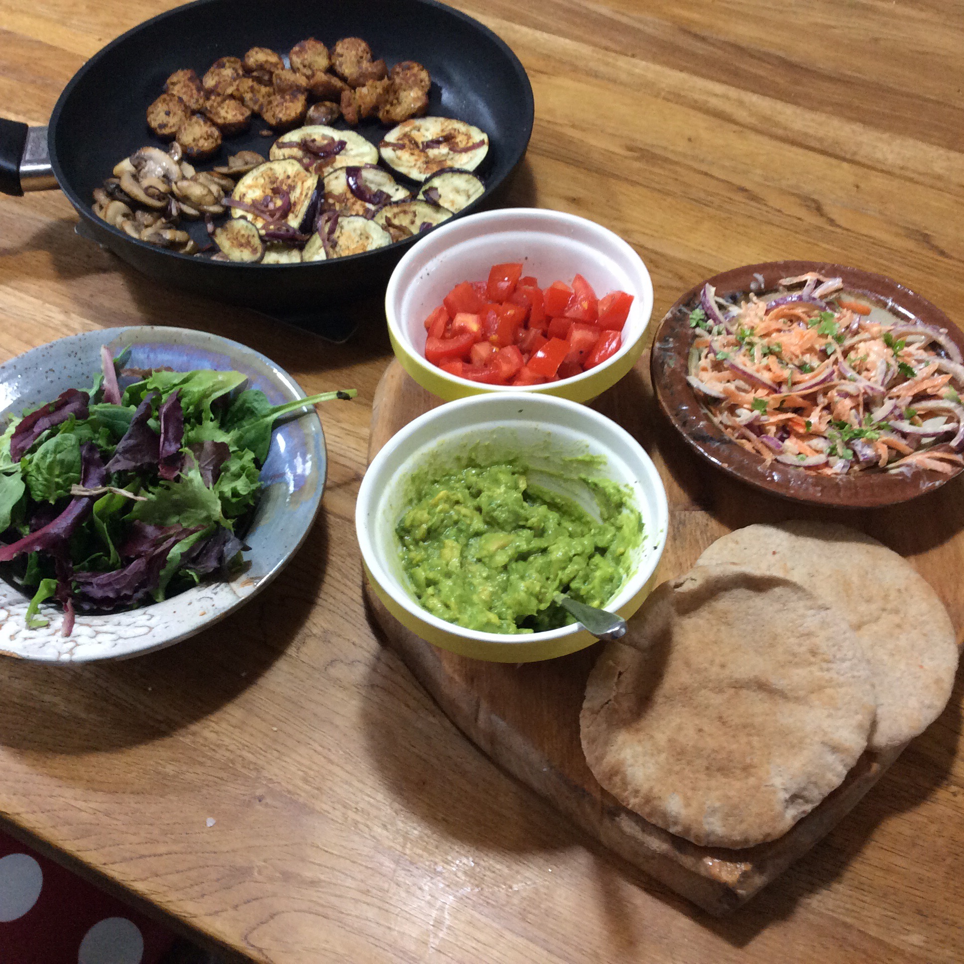 Moroccan falafels, smokey grilled aubergines with fried onions, sautéed mushrooms, homemade coleslaw, guacamole and salad, all stuffed in warm pitta bread with chilli sauce. A thumbs up all round.